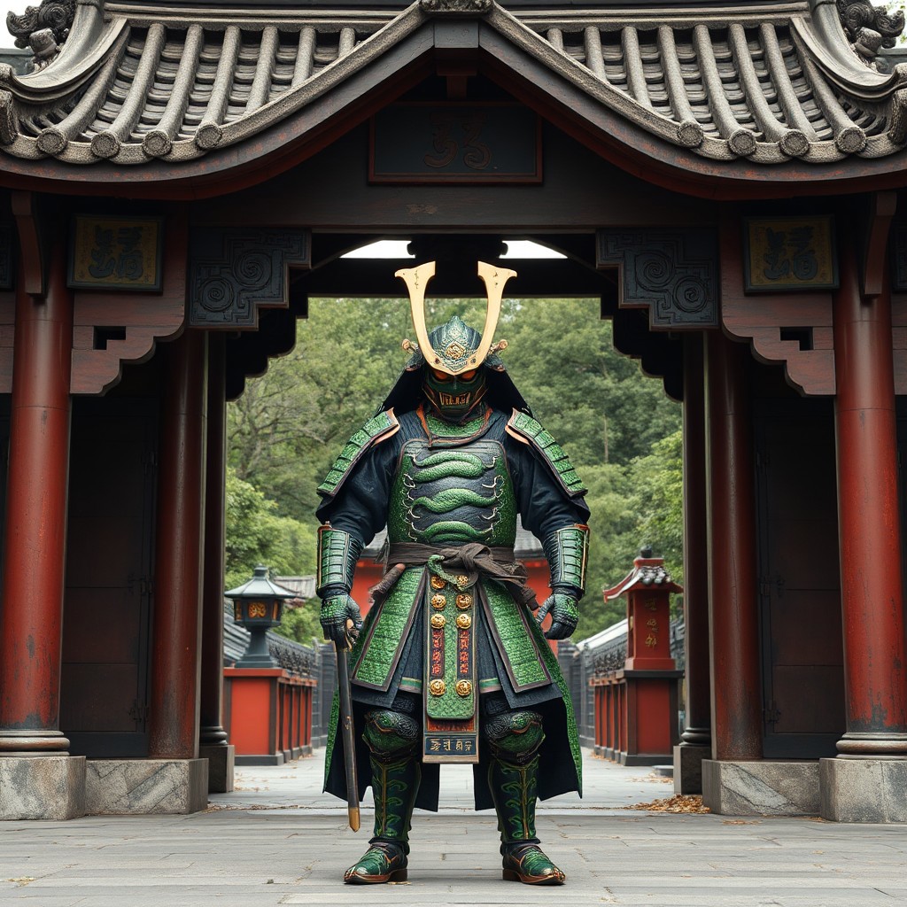 a green snake theme armor samurai standing in-between a traditional Chinese archway