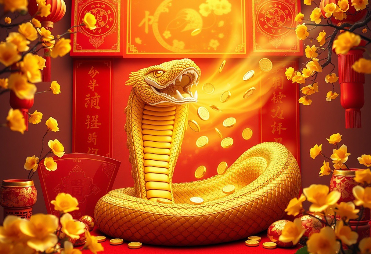 The image depicts a majestic golden cobra surrounded by a vibrant and celebratory setting. The cobra is open-mouthed, spewing a stream of glowing gold coins, symbolizing wealth and prosperity. The background features traditional Chinese red elements, including red envelopes and decorative scrolls, along with blooming yellow flowers, evoking a festive and auspicious atmosphere. The scene is rich in warm golden tones, emphasizing the themes of abundance and good fortune.