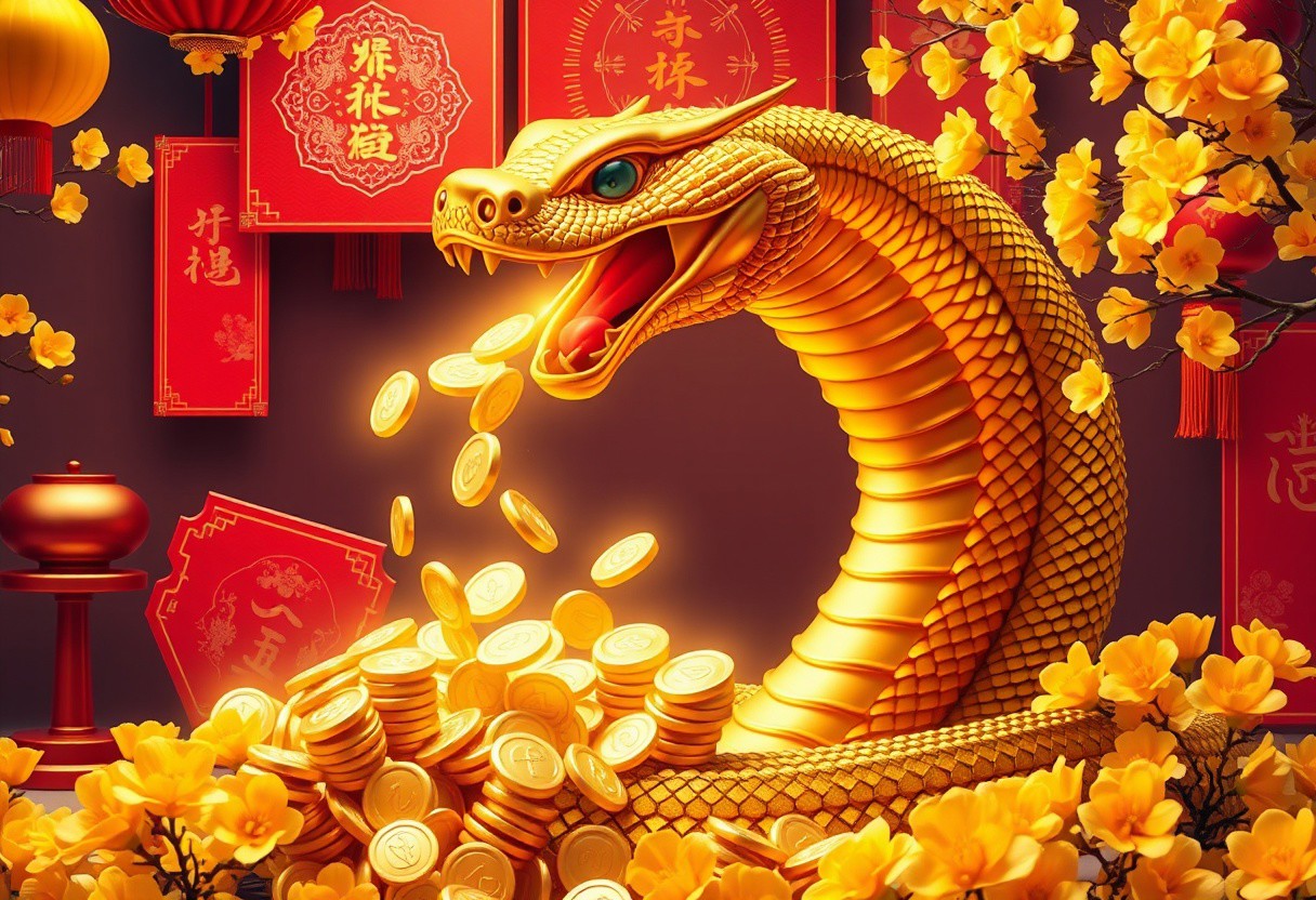 The image depicts a majestic golden cobra surrounded by a vibrant and celebratory setting. The cobra is open-mouthed, spewing a stream of glowing gold coins, symbolizing wealth and prosperity. The background features traditional Chinese red elements, including red envelopes and decorative scrolls, along with blooming yellow flowers, evoking a festive and auspicious atmosphere. The scene is rich in warm golden tones, emphasizing the themes of abundance and good fortune.