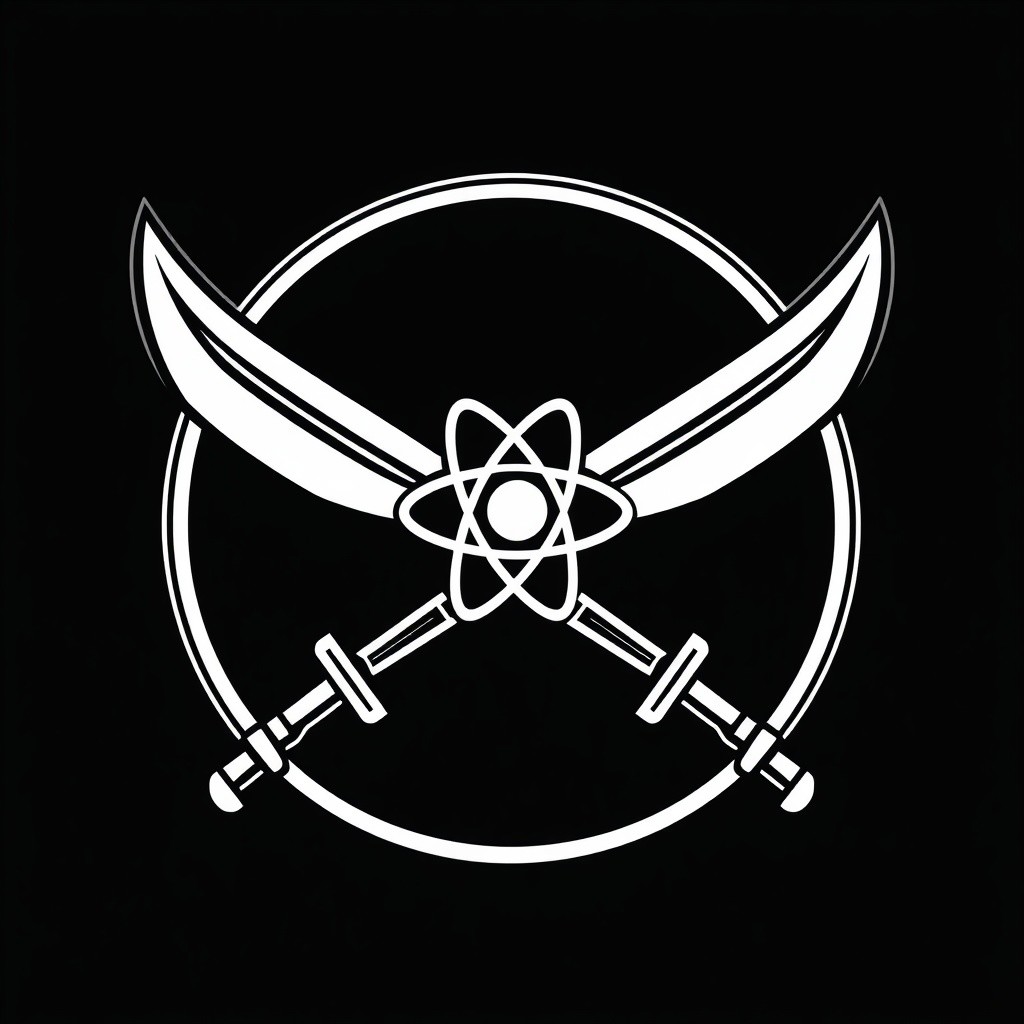 (stylized logo, emblem, vector art), (symbol of a crossed swords with an image of an atom in the center), (solid colors, thick-linework), white outline, black background, crossed swords with the emblem of the atom symbol white in the center, heraldic, black background, HDR, UHD,