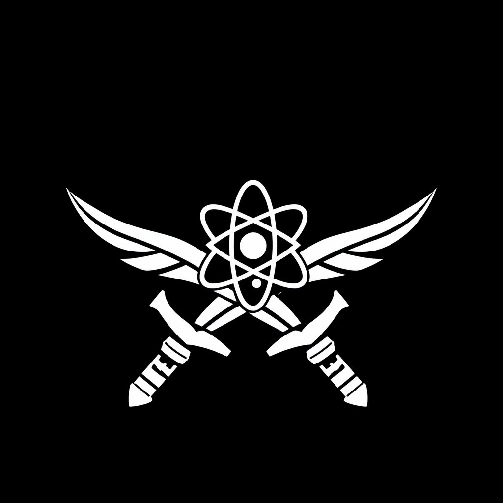 (stylized logo, emblem, vector art), (symbol of a crossed swords with an image of an atom in the center), (solid colors, thick-linework), white outline, black background, crossed swords with the emblem of the atom symbol white in the center, heraldic, black background, HDR, UHD,