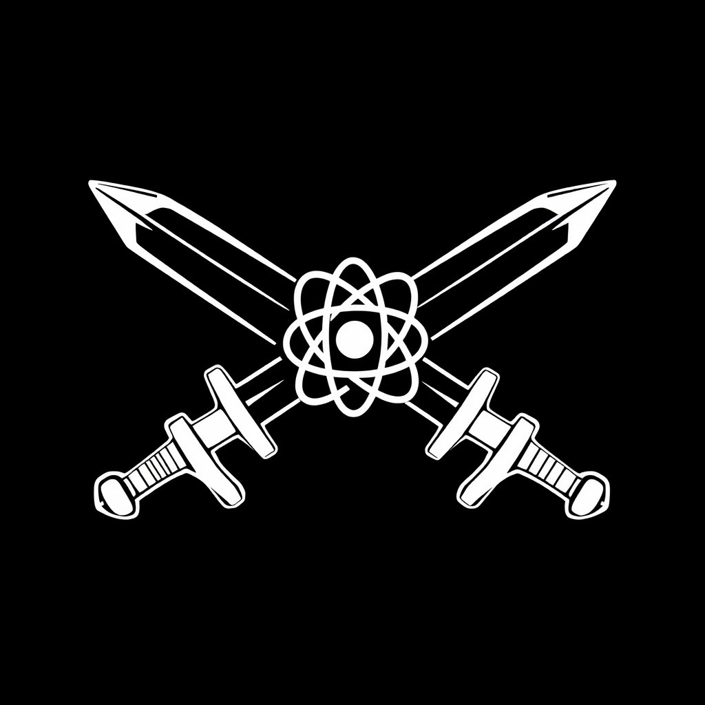 (stylized logo, emblem, vector art), (symbol of a crossed swords), (solid colors, thick-linework), white outline, black background, crossed swords with the emblem of the atom symbol white in the center, heraldic, black background, HDR, UHD,