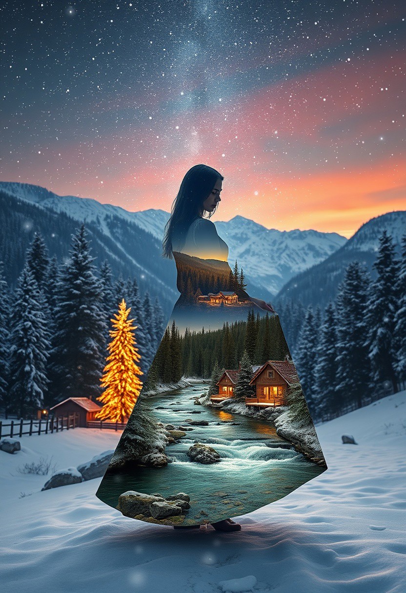 realism realistic ✨ glass girl with landscape on the dress,girl river one piece,starry night on the dress,stars on the dress glow girl on the dress landscape , forest,river flowing down girl with landscape winter winter new year, Christmas tree, lights, glitter snowflakes directly on the dress-recaburnaya,-ryabina-dense forest-mountains snowy, on the dress, puffy dress, full-length, real photo, double exposure, on the dress sunset 🌇 hands holding the edges of the dress puffy colour. new year village on the dress