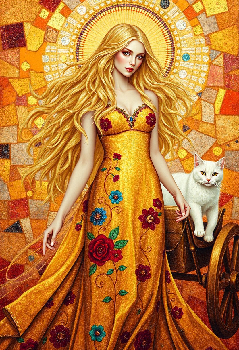 A radiant and ethereal depiction of Freyja, the Norse goddess of love and war, painted in the shimmering, gilded style of Gustav Klimt. Freyja is adorned in a golden gown embroidered with intricate floral patterns in ruby red, sapphire blue, and emerald green. Her flowing blonde hair cascades like liquid sunlight, intertwined with small golden leaves. Behind her, a pair of glowing white cats pull her chariot, their fur dotted with flecks of silver. The backdrop features an abstract mosaic of warm, glowing hues—sunset orange, soft pink, and rich gold—evoking both her divine beauty and her fierce warrior spirit.