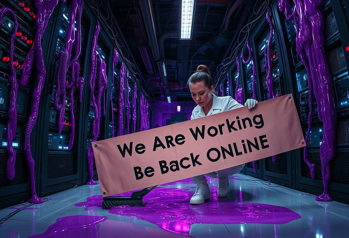 A high-tech server room in ruins, illuminated by the eerie glow of malfunctioning neon-blue and red LED lights. The walls are lined with towering server racks, each oozing thick, jelly-like purple goo that drips from vents and pours from cracks. The goo gleams unnaturally, casting faint purple light onto the floor, which is slick and reflective. Wires hang limply, and some spark with electricity, adding to the chaotic, rotten ambiance. Amid the chaos, a perfectionist cleaning woman with a determined expression meticulously scrubs at the goo with a professional-grade cleaning tool. She is dressed in a spotless uniform, complete with gloves and a neatly tied back hairstyle. Her pristine appearance is in sharp contrast to the grimy, deteriorated environment. In the foreground, a large banner hangs crookedly to one side, reading: “We Are Working to Be Back Online” in bold, futuristic typography. The shot is taken with a 12mm cinema fisheye lens, giving a dramatic distortion to the scene. The servers seem to curve ominously toward the viewer, amplifying the sense of decay and urgency in the room.