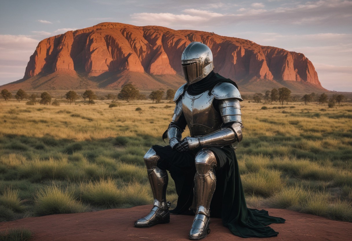 Create an image of a knight sitting on a green throne in front of the iconic Ayers Rock during sunrise. The knight is wearing a full suit of black, shiny armor with multiple layers of metal plates and a pointed helmet. The knight's legs are crossed, and its hands are resting on its knees. The image is trending on Artstation and has a predominantly red color scheme.