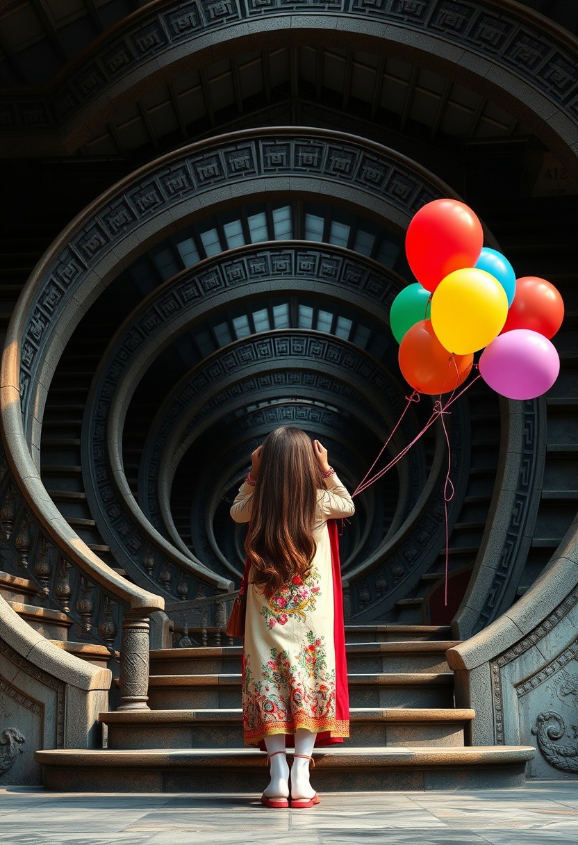 a photorealistic image, 4K, absurdres, amazing quality, hires, 1girl is standing in front of complicated stairs, helical stairs, holding colorful balloons, long hair, wearing traditional cloths,