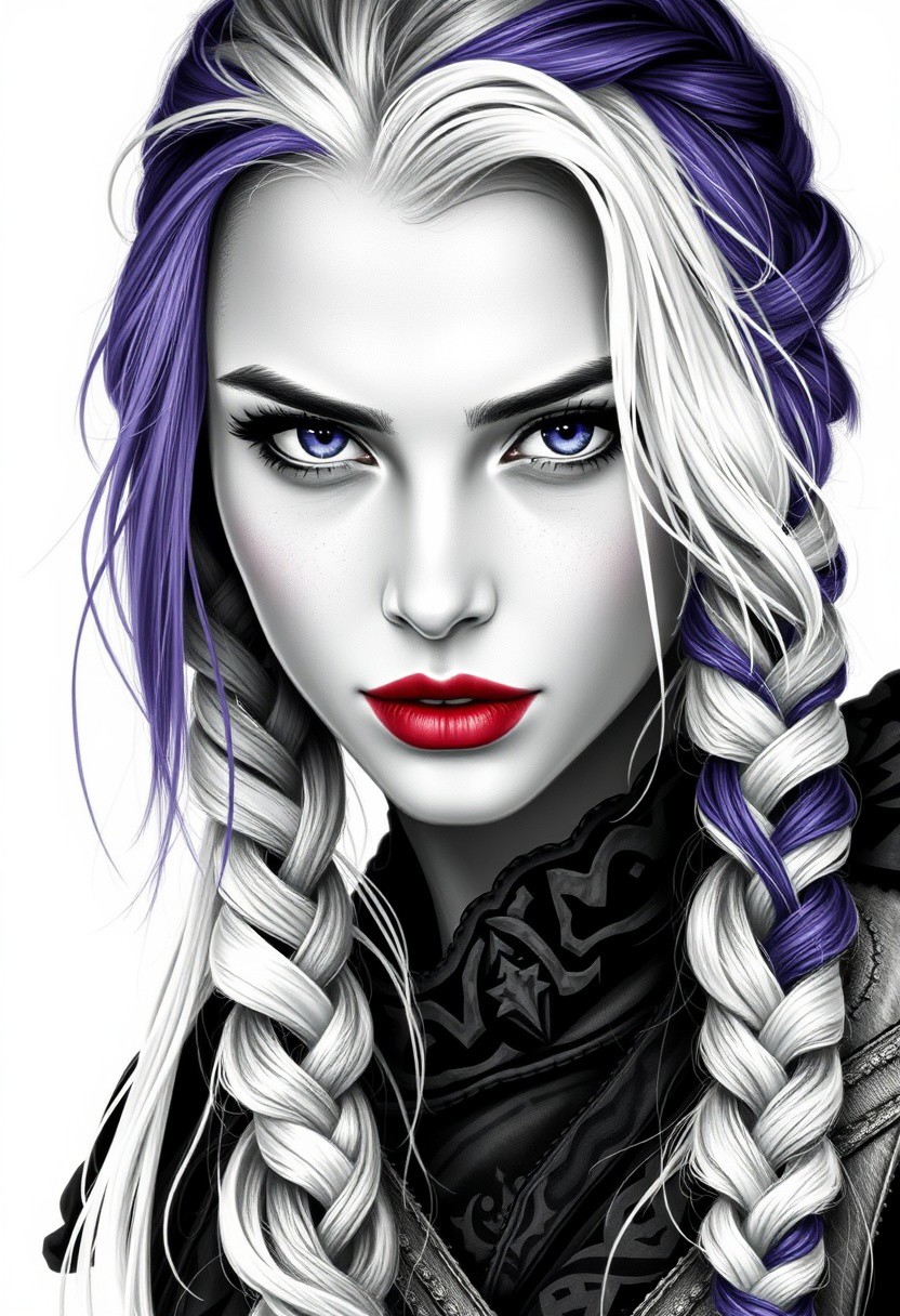 Different mimics and womanfaces, black and white portrait of a Viking warrior woman with braided purple and white hair, wearing red lipstick, Purple eyes. long blonde braid, looking forward, white background, high contrast, low color palette, fantasy style, detailed --chaos 55 --ar 1:2 --personalize yruxpc2 --stylize 750 --v 6.1
