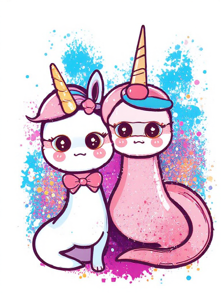 cute shebaobao snkae baby, star eyes, best friend with an elegant unicorn with rainbow halter mad-cbrpnksplshrt, paint splashes, outrun
