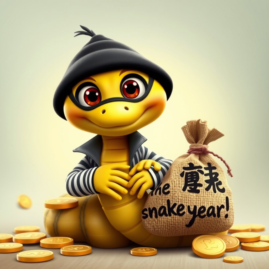 A whimsical movie poster featuring an adorable, cute snake shebaobao with large, expressive eyes and a mischievous grin, cleverly disguised as a bank robber, wearing a sleek black mask and a fitted striped shirt. The snake coils elegantly around a stack of oversized gold coins, playfully clutching a burlap bag labeled "The snake year!".