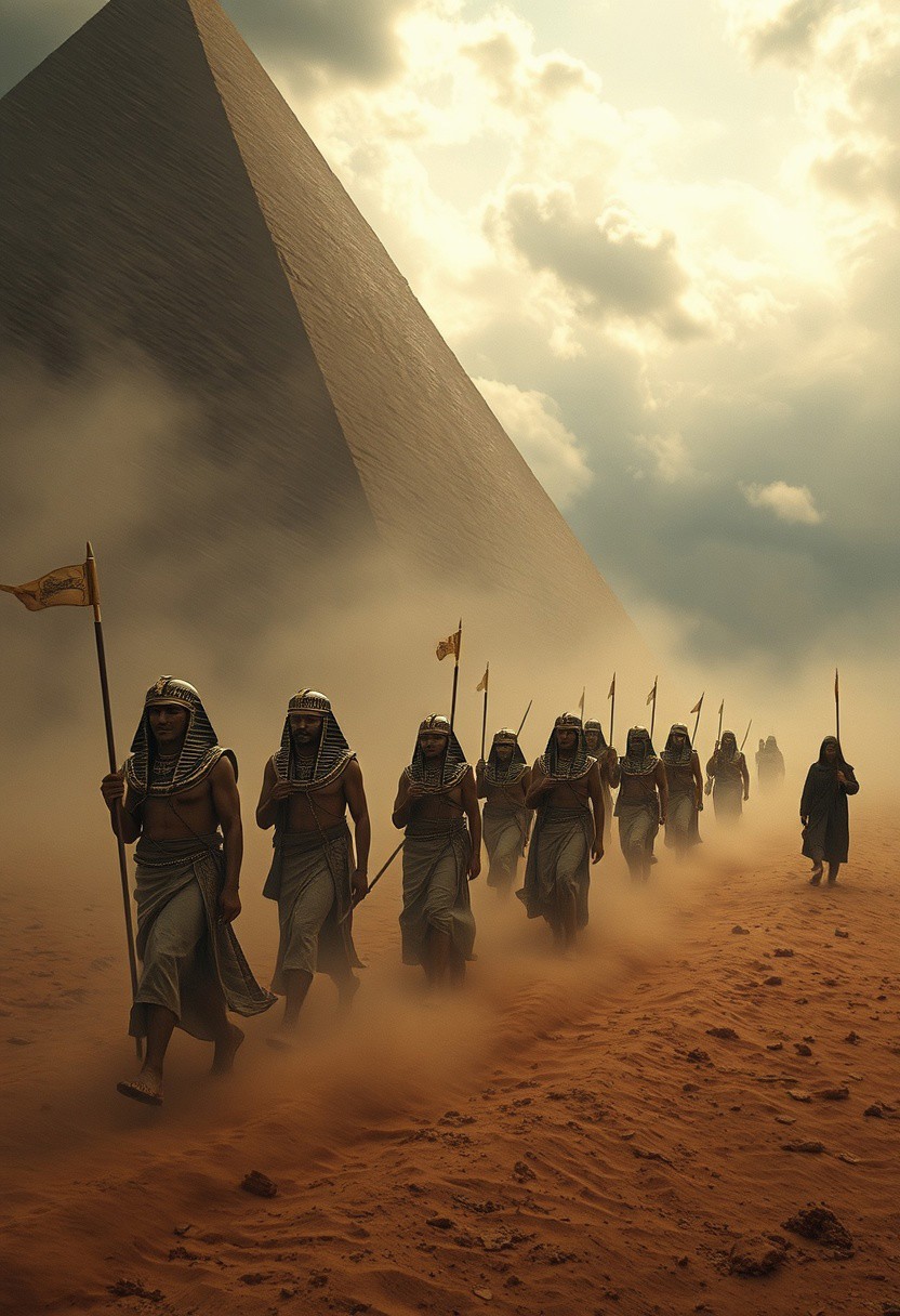 Intense dramatic weather, unusual original fine art photography. Ancient Egyptian art style depicting a parade of pharaoh's concubines in the style of Aleandro Burdesio's Dust Hopper, elegant, historic essence, cinematic lighting, windy atmosphere, oil painting in the style of Bill Sienkiewicz and Pablo Amaringo. Associated Press style, soft contrast, soft saturation, stormy skies.