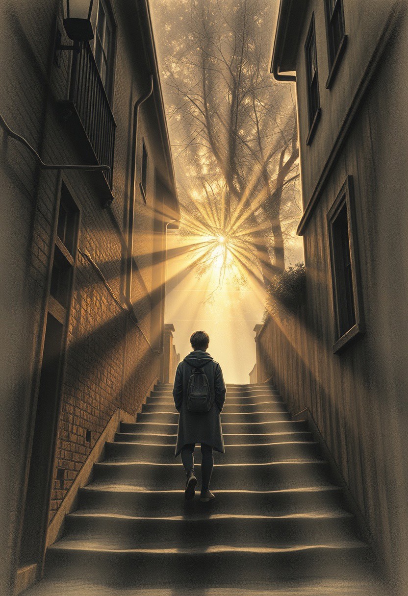 Volumetric lighting enhances a detailed charcoal drawing of a person on old house steps, looking towards a tree-lined street in golden light. Light beams pierce through dust or fog, creating a dramatic effect. 8k resolution, professional quality.
