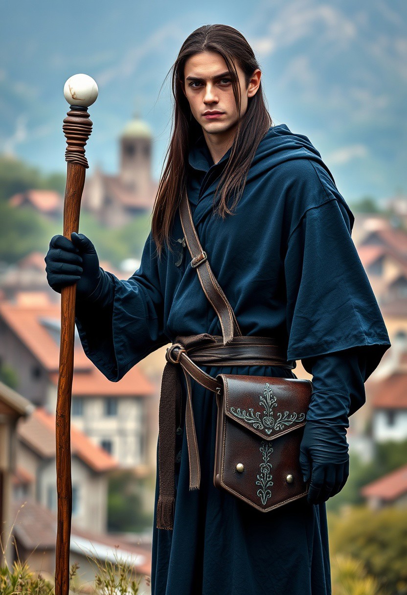 Low Fantasy. 25 year old half-elf male, very dark marine blue wizard robe, long straight dark brown hair. Holding a simple wood staff with a white marble stone at the tip. wearing a dark brown leather satchel embroidered with silver thread. loose sleeves that only to go the elbows, black gloves. realistic photograph. blurry village in the background
