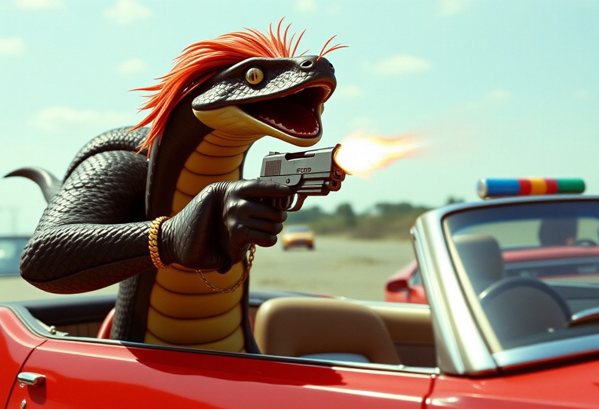 shebaobao, a snake with hippy hair shooting a gun out the window of a ford mustang, wearing gold chains, in a police chase, 1970's action movie style