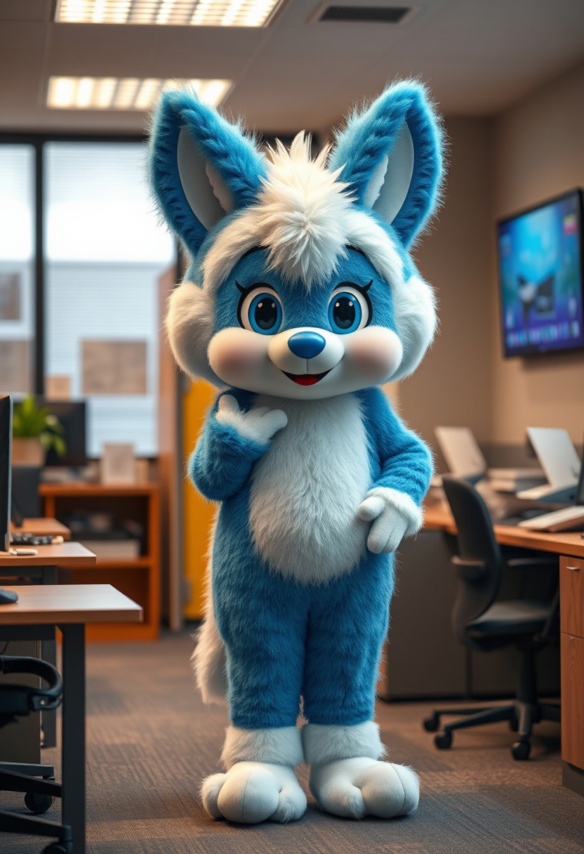 a photorealistic image, 4K, absurdres, amazing quality, hires, Furry Mascot costumed, plushy like, animal ears, standing in office, blue and white fur, cute,