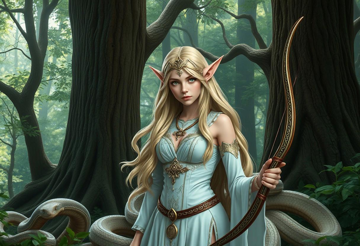 Loreen in the Magical Forest: Picture Loreen, a female elf snake lord, in a magical forest. She stands among majestic trees, surrounded by snakes that coil around her. Loreen has light green eyes with snake pupils, long shiny hair in gold and silver, and ethereal pastel-colored clothing decorated with snake symbols. She carries a typical elven bow and arrows.