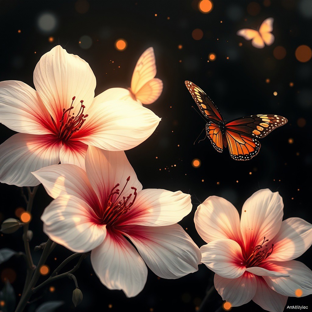 ArsMJStyle, impressionism, Ukiyo-e, A surreal and painterly composition featuring **radiant white flowers** and **dark ethereal butterflies** against a pitch-black background. The flowers exude a sense of purity and holiness. The petals are stained with crimson blood. The butterflies pulse with an otherworldly light, and their wings are traced with intricate patterns. The atmosphere is enhanced by a dreamy **bokeh effect** that scatters soft glimmers of gold and crimson throughout the composition, creating depth and a sense of quiet wonder. The interplay of **rich white highlights and deep black shadows** evokes an enchanting, almost mystical ambiance. Subtle sparks float in the air, adding a dynamic, surreal quality to the scene. The overall aesthetic is vivid yet balanced, emphasizing the **contrast between the glowing warmth of the flowers and harshness of the butterflies**. Rendered in **8K ultra-detail**, the textures are hyper-realistic, while the colors glow with an intense vibrancy, embodying an elegant harmony of surreal beauty and luxurious simplicity.