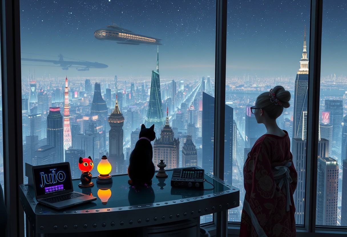 Jiji, the cat from Kiki's Delivery Service sits on a cluttered metal riveted desk with transparent top and rgb led computer components visible inside, On the desk are a maneki neko statue and a lava lamp, Jiji the Black Cat is looking out of a seamless and futuristic floor to ceiling window that looks out at a very high view from an apartment on the 400th floor of a futuristic Tokyo skyscraper, the year is 2250, The city has thousands of enormous wide and tall futuristic skyscrapers and space ships covered with lights in the sky, (((Kiki from Kiki's Delivery Service, 24 years old, is standing next to the cat looking out at the enormous city at night, filled with buildings of many shapes and sizes, some over a mile tall))), Kiki is dressed in an ornate Japanese style bath robe. An enormous deco starship with futuristic lighting and design is visible high above the city, and a space station is visible in the background among the stars, many many small flying personal transports are flying around the city, multiple elevated train tubes are visible moving between large buildings, The woman's hair is messy from just waking up and tied up with a ribbon. Artistic cyberpunk, dynamic perspective, The focus is on Jiji and Kiki standing together looking out the window at the view together, (((overall architectural aesthetic is Art Deco Cyberpunk))). Mt Fuji can be seen in the far distance,