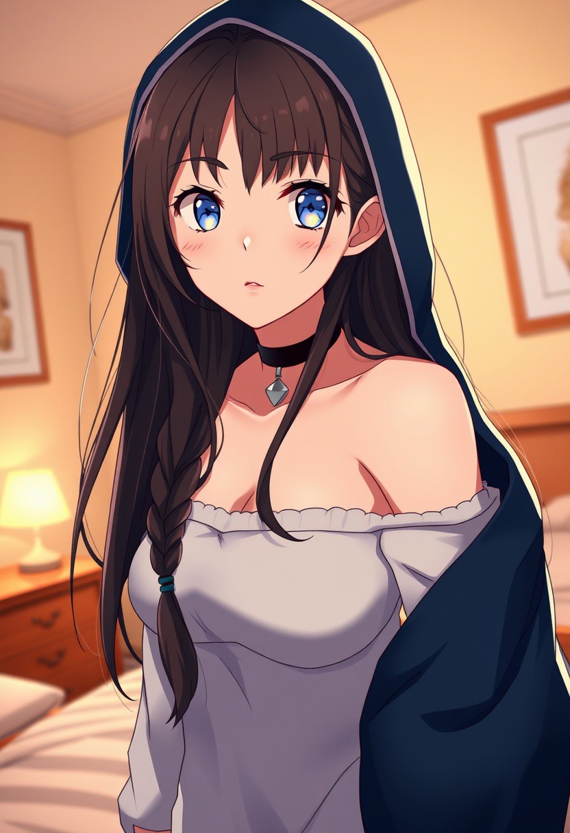 Portrait photography, (Innocent and alluring woman in off-shoulder shirt:1.3), Dynamic angle composition, Long flowing hair, Beautiful expressive eyes, (Delicate freckles:1.2), Medium breasts, Subtle cleavage, Tight body posture, (Cozy bedroom background:1.2), Warm tones, Soft furnishings, High contrast lighting, Captured with a Canon EOS R5, 50mm f/1.2 lens, Vivid highlights, Dramatic shadows, Film grain texture, Rich details, rating_explicit, score_9, score_8_up, score_7_up, score_6_up, derpibooru_p_95, source_anime,anime,milf,simple,cartoon,blush,horny,1girl,breasts,hood,solo,large breasts,long hair,cleavage,cloak,bridal gauntlets,hooded cloak,choker,hood up,parted lips,braid,Expressiveh,<lora:Expressive_H:1>,<lora:breasts++-PD-swooping-1.0:1>,swooping breasts,huge breasts,breasts apart,