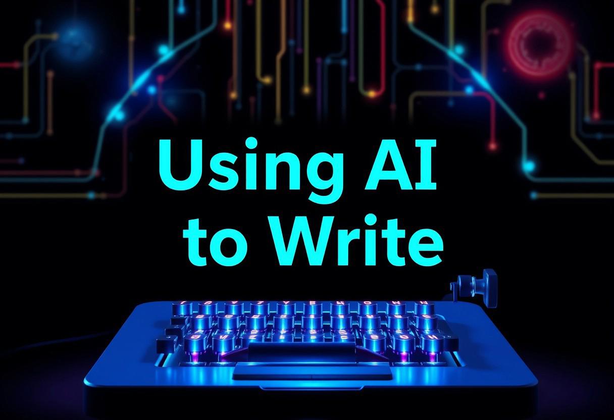 cozy sleek modern professional Logo design with the text "Using AI to Write" prominently displayed in bold bright professional sans-serif typography. Design ties both writing and digital technology together, with digital computer pixels, a pen, a typewriter, etc. Cozy warm welcoming design that is friendly and approachable, while being professional, colorful, vibrant, neon, light-art, electric, SCIFI, science-fiction, mystical, spiritual, dreamy