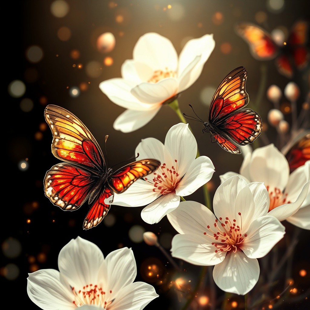 ArsMJStyle, impressionism, Ukiyo-e, A surreal and painterly composition featuring **radiant white flowers** and **dark ethereal butterflies** against a pitch-black background. The flowers exude a sense of purity and holiness. The petals are stained with crimson blood. The butterflies pulse with an otherworldly light, and their wings are traced with intricate patterns. The atmosphere is enhanced by a dreamy **bokeh effect** that scatters soft glimmers of gold and crimson throughout the composition, creating depth and a sense of quiet wonder. The interplay of **rich white highlights and deep black shadows** evokes an enchanting, almost mystical ambiance. Subtle sparks float in the air, adding a dynamic, surreal quality to the scene. The overall aesthetic is vivid yet balanced, emphasizing the **contrast between the glowing warmth of the flowers and harshness of the butterflies**. Rendered in **8K ultra-detail**, the textures are hyper-realistic, while the colors glow with an intense vibrancy, embodying an elegant harmony of surreal beauty and luxurious simplicity.
