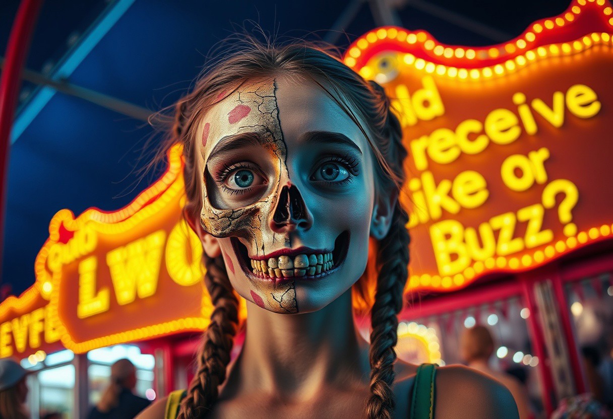 “A whimsical and surreal portrait of a girl with a distorted, comical face, featuring one eye larger than the other, vibrant face paint, and two playful braids in her hair. Half of her face is a real, bones skull, with detailed, decayed bone structure, exposing cracked and aged bones, and the skull appears lifelike yet worn with time. The other half is covered in exaggerated, colorful face paint. The skull gives off a gritty, almost macabre vibe, blending with the lively and hype atmosphere of the carnival. Captured using a 12mm fisheye cinematic prime lens for an exaggerated perspective. The setting is a lively carnival with neon lights, whimsical decorations, and a dreamy yet unsettling atmosphere. A rotten, old light banner in the background displays the text: ‘Could I receive a Like or Buzz?’ in flickering, uneven letters. The colors and contrasts are enhanced for a surreal effect, combining playful and eerie styles, with a mix of humor and dark visual artistry.”