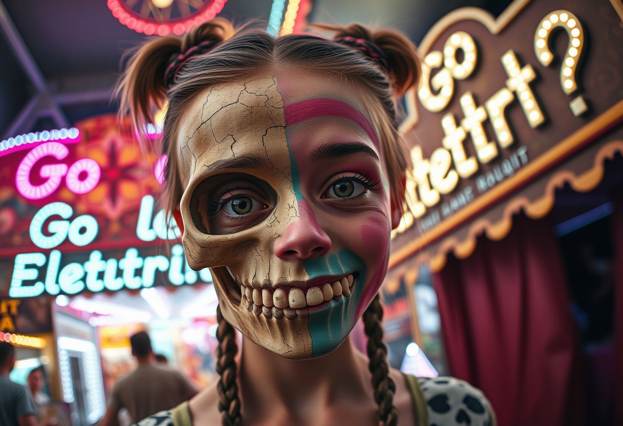 “A whimsical and surreal portrait of a girl with a distorted, comical face, featuring one eye larger than the other, vibrant face paint, and two playful braids in her hair. Half of her face is a real, bones skull, with detailed, decayed bone structure, exposing cracked and aged bones, and the skull appears lifelike yet worn with time. The other half is covered in exaggerated, colorful face paint. The skull gives off a gritty, almost macabre vibe, blending with the lively and hype atmosphere of the carnival. Captured using a 12mm fisheye cinematic prime lens for an exaggerated perspective. The setting is a lively carnival with neon lights, whimsical decorations, and a dreamy yet unsettling atmosphere. A rotten, old light banner in the background displays the text: ‘Go Elettric!?’ in flickering, uneven letters. The colors and contrasts are enhanced for a surreal effect, combining playful and eerie styles, with a mix of humor and dark visual artistry.”