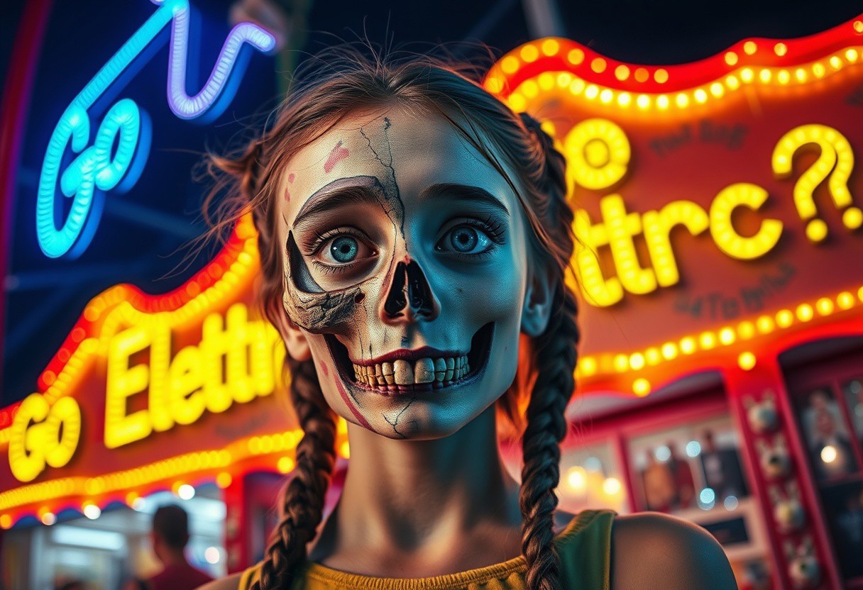 “A whimsical and surreal portrait of a girl with a distorted, comical face, featuring one eye larger than the other, vibrant face paint, and two playful braids in her hair. Half of her face is a real, bones skull, with detailed, decayed bone structure, exposing cracked and aged bones, and the skull appears lifelike yet worn with time. The other half is covered in exaggerated, colorful face paint. The skull gives off a gritty, almost macabre vibe, blending with the lively and hype atmosphere of the carnival. Captured using a 12mm fisheye cinematic prime lens for an exaggerated perspective. The setting is a lively carnival with neon lights, whimsical decorations, and a dreamy yet unsettling atmosphere. A rotten, old light banner in the background displays the text: ‘Go Elettric!?’ in flickering, uneven letters. The colors and contrasts are enhanced for a surreal effect, combining playful and eerie styles, with a mix of humor and dark visual artistry.”