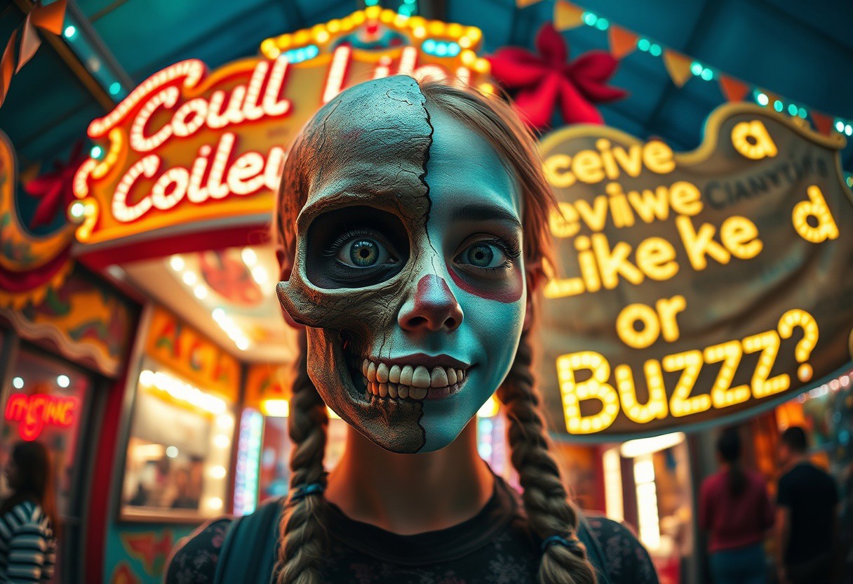 “A whimsical and surreal portrait of a girl with a distorted, comical face, featuring one eye larger than the other, vibrant face paint, and two playful braids in her hair. Half of her face is a real, bones skull, with detailed, decayed bone structure, exposing cracked and aged bones, and the skull appears lifelike yet worn with time. The other half is covered in exaggerated, colorful face paint. The skull gives off a gritty, almost macabre vibe, blending with the lively and hype atmosphere of the carnival. Captured using a 12mm fisheye cinematic prime lens for an exaggerated perspective. The setting is a lively carnival with neon lights, whimsical decorations, and a dreamy yet unsettling atmosphere. A rotten, old light banner in the background displays the text: ‘Could I receive a Like or Buzz?’ in flickering, uneven letters. The colors and contrasts are enhanced for a surreal effect, combining playful and eerie styles, with a mix of humor and dark visual artistry.”