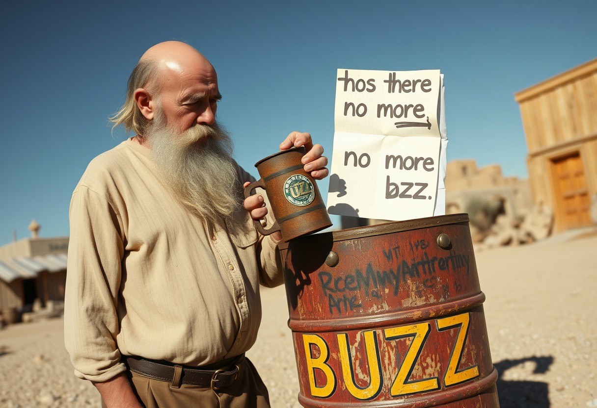 an old man with long beard bald holding a rusty metal mug with the text "BUZZ" trying to fill it from an old drum with the legend buzz on the side with a sheet stuck on top that says "there is no more buzz" in a desert town