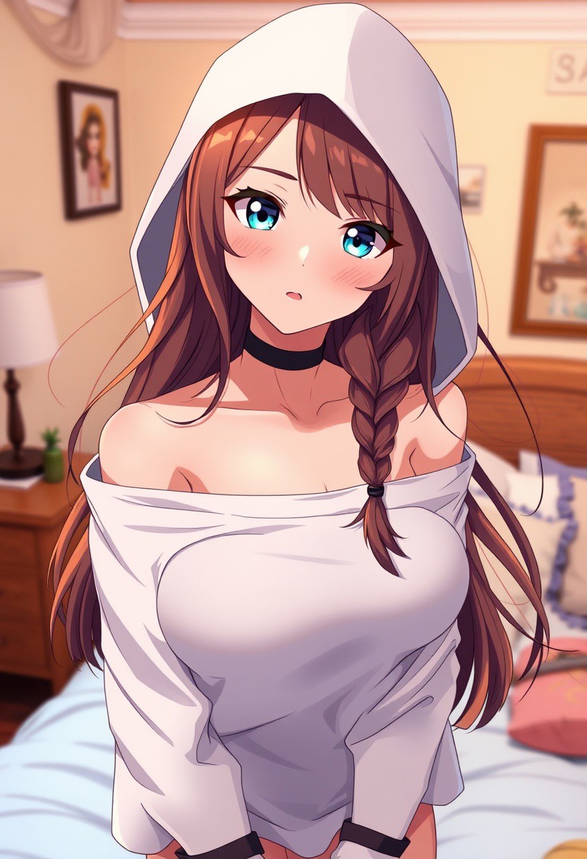 Portrait photography, (Innocent and alluring woman in off-shoulder shirt:1.3), Dynamic angle composition, Long flowing hair, Beautiful expressive eyes, (Delicate freckles:1.2), Medium breasts, Subtle cleavage, Tight body posture, (Cozy bedroom background:1.2), Warm tones, Soft furnishings, High contrast lighting, Captured with a Canon EOS R5, 50mm f/1.2 lens, Vivid highlights, Dramatic shadows, Film grain texture, Rich details, rating_explicit, score_9, score_8_up, score_7_up, score_6_up, derpibooru_p_95, source_anime,anime,milf,simple,cartoon,blush,horny,1girl,breasts,hood,solo,large breasts,long hair,cleavage,cloak,bridal gauntlets,hooded cloak,choker,hood up,parted lips,braid,Expressiveh,<lora:Expressive_H:1>,<lora:breasts++-PD-swooping-1.0:1>,swooping breasts,huge breasts,breasts apart,