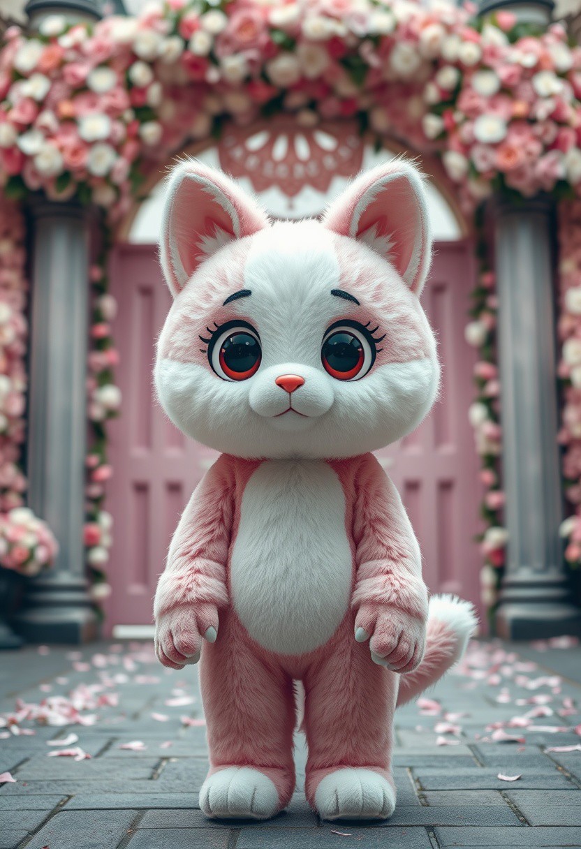 a photorealistic image, 4K, absurdres, amazing quality, hires, Furry cat mascot costumed, plushy like, animal ears, big eyes, standing in front of gigantic gate that is made from flowers, pink and white fur, cute, anime, doll, kawaii,