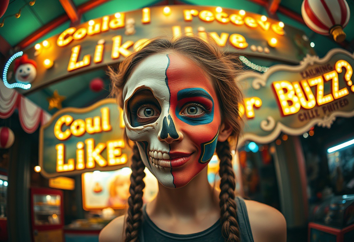 “A whimsical and surreal portrait of a girl with a distorted, comical face, featuring one eye larger than the other, vibrant face paint, and two playful braids in her hair. Half of her face is a real skull, with detailed bone structure, while the other half is covered in colorful, exaggerated face paint. Captured using a 12mm fisheye cinematic prime lens for an exaggerated perspective. The setting is a lively carnival with colorful lights, whimsical decorations, and a dreamy atmosphere. A rotten, old light banner in the background displays the text: ‘Could I receive a Like or Buzz?’ in flickering, uneven letters. The colors and contrasts are enhanced for a surreal effect, inspired by a mix of playful and artistic styles, blending humor and visual artistry.”