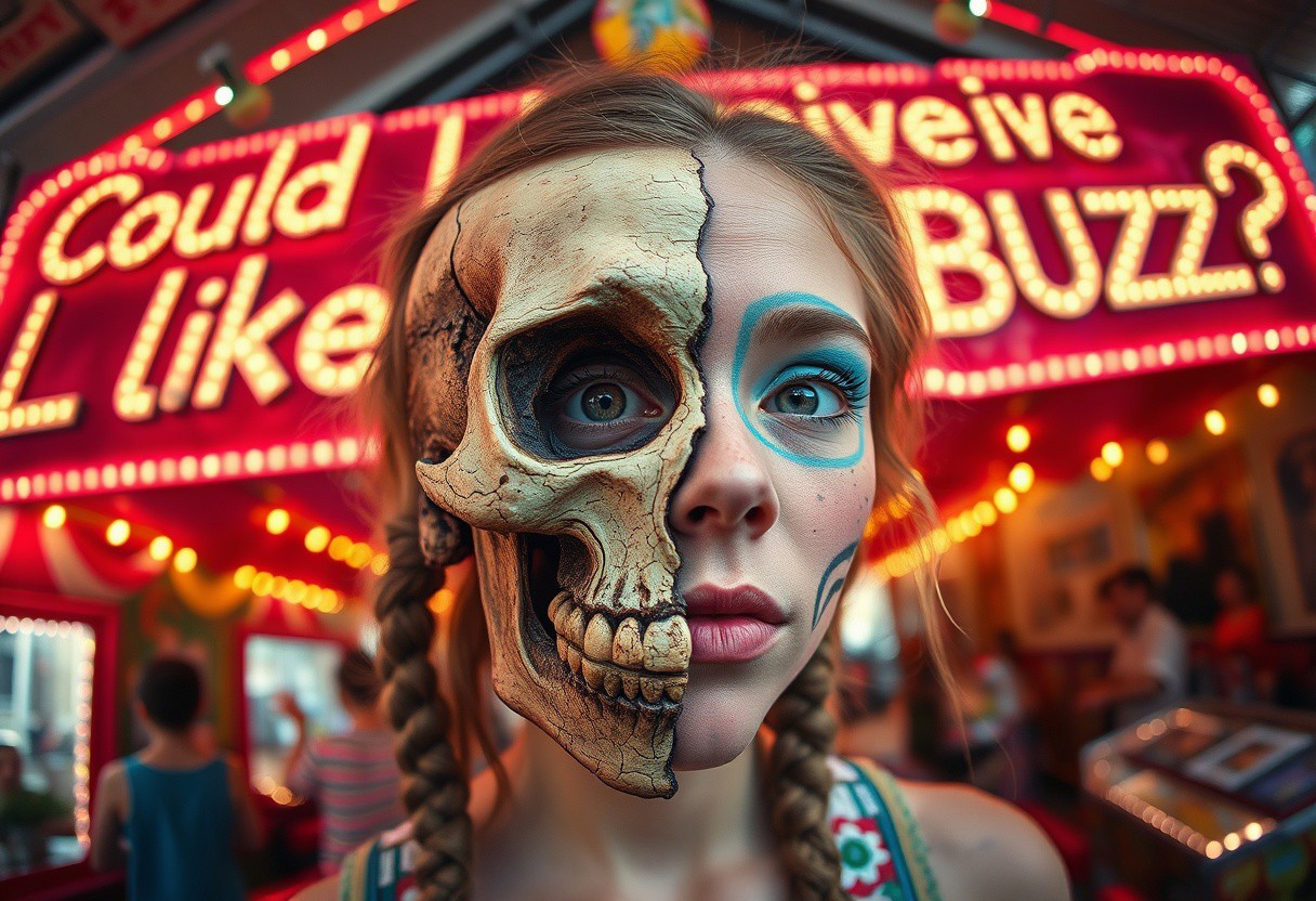 “A whimsical and surreal portrait of a girl with a distorted, comical face, featuring one eye larger than the other, vibrant face paint, and two playful braids in her hair. Half of her face is a real, rotten skull, with detailed, decayed bone structure, exposing cracked and aged bones, and the skull appears lifelike yet worn with time. The other half is covered in exaggerated, colorful face paint. The skull gives off a gritty, almost macabre vibe, blending with the lively and hype atmosphere of the carnival. Captured using a 12mm fisheye cinematic prime lens for an exaggerated perspective. The setting is a lively carnival with neon lights, whimsical decorations, and a dreamy yet unsettling atmosphere. A rotten, old light banner in the background displays the text: ‘Could I receive a Like or Buzz?’ in flickering, uneven letters. The colors and contrasts are enhanced for a surreal effect, combining playful and eerie styles, with a mix of humor and dark visual artistry.”