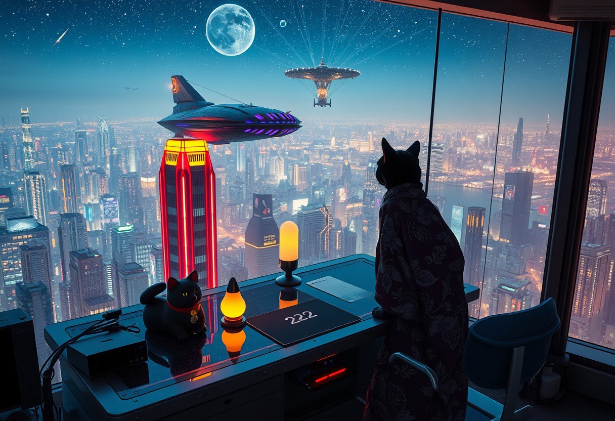 Jiji, the cat from Kiki's Delivery Service sits on a cluttered metal riveted desk with transparent top and rgb led computer components visible inside, On the desk are a maneki neko statue and a lava lamp, Jiji the Black Cat is looking out of a seamless and futuristic floor to ceiling window that looks out at a very high view from an apartment on the 400th floor of a futuristic Tokyo skyscraper, the year is 2250, The city has thousands of enormous wide and tall futuristic skyscrapers and space ships covered with lights in the sky, (((Kiki from Kiki's Delivery Service, 24 years old, is standing next to the cat looking out at the enormous city at night, filled with buildings of many shapes and sizes, some over a mile tall))), Kiki is dressed in an ornate Japanese style bath robe. An enormous deco starship with futuristic lighting and design is visible high above the city, and a space station is visible in the background among the stars, many many small flying personal transports are flying around the city, multiple elevated train tubes are visible moving between large buildings, The woman's hair is messy from just waking up and tied up with a ribbon. Artistic cyberpunk, dynamic perspective, The focus is on Jiji and Kiki standing together looking out the window at the view together, (((overall architectural aesthetic is Art Deco Cyberpunk))). Mt Fuji can be seen in the far distance,