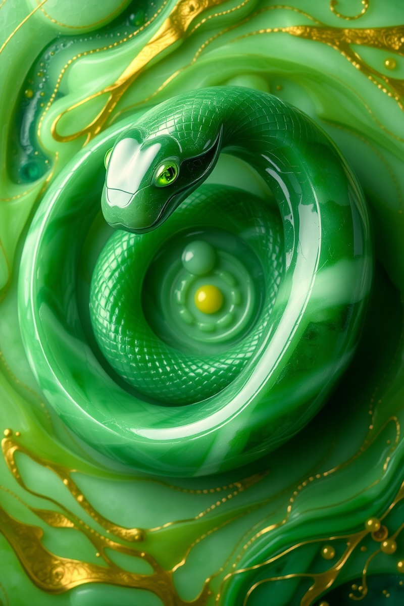 jade_snake. A surreal and abstract image of a jade snake coiling infinitely into itself, forming a mesmerizing spiral. Its body is a blend of polished jade and liquid emerald, shifting fluidly between solid and translucent states. The background is an abstract swirl of green and gold, resembling a dreamscape or a portal to another dimension. The snake’s eyes are glowing orbs of light, and faint tendrils of energy radiate from its body, giving it an aura of pure mystery and power