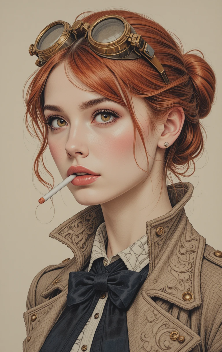 A detailed, hyperrealistic pencil drawing portrait of a steampunk-inspired woman. A young woman with vibrant, reddish-brown hair pulled back in a bun, wearing ornate brass goggles. Her expression is slightly pensive, with a cigarette in her mouth. The woman has striking, golden-brown eyes, and full, rosy lips. Her skin tone is a light beige, and her facial features are finely detailed. She's dressed in a textured, beige-brown, steampunk-style jacket or coat with intricate details, including a decorative black bow tie. The artwork utilizes a warm, muted color palette, using shades of brown, beige, red, and brass. The lighting in the portrait is soft and focused on the subjects face and upper body. The style is reminiscent of an impressionistic pencil drawing, capturing both the form and texture of the subject with meticulous attention to detail.