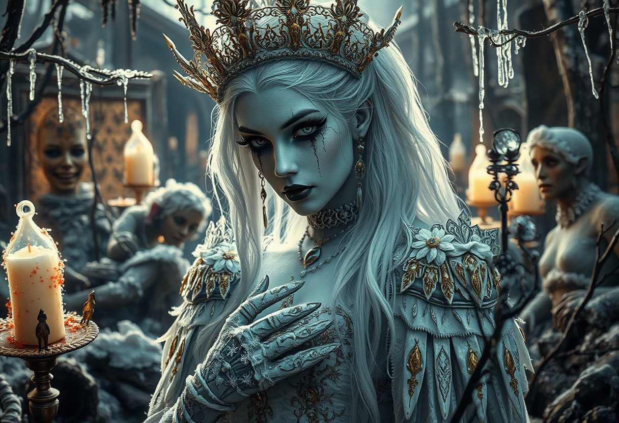 “A hyperrealistic depiction of an ice princess with an eerie ambiance, wearing heavy gothic makeup, set in a rotten and decayed world. The scene is intricate with frost-covered elements, blending a fantasy horror concept with a dark fairytale wonderland background. The white and gold color palette contrasts sharply with decayed, rotting surroundings, creating a haunting atmosphere. The image uses a 12mm lens effect to enhance depth and distortion, with sharp contrasts, deep shadows, and an ultra-detailed photorealistic style. The ice princess appears both enchanting and sinister, emanating mesmerizing visual storytelling in a chilling, frost-bitten, decayed environment.”