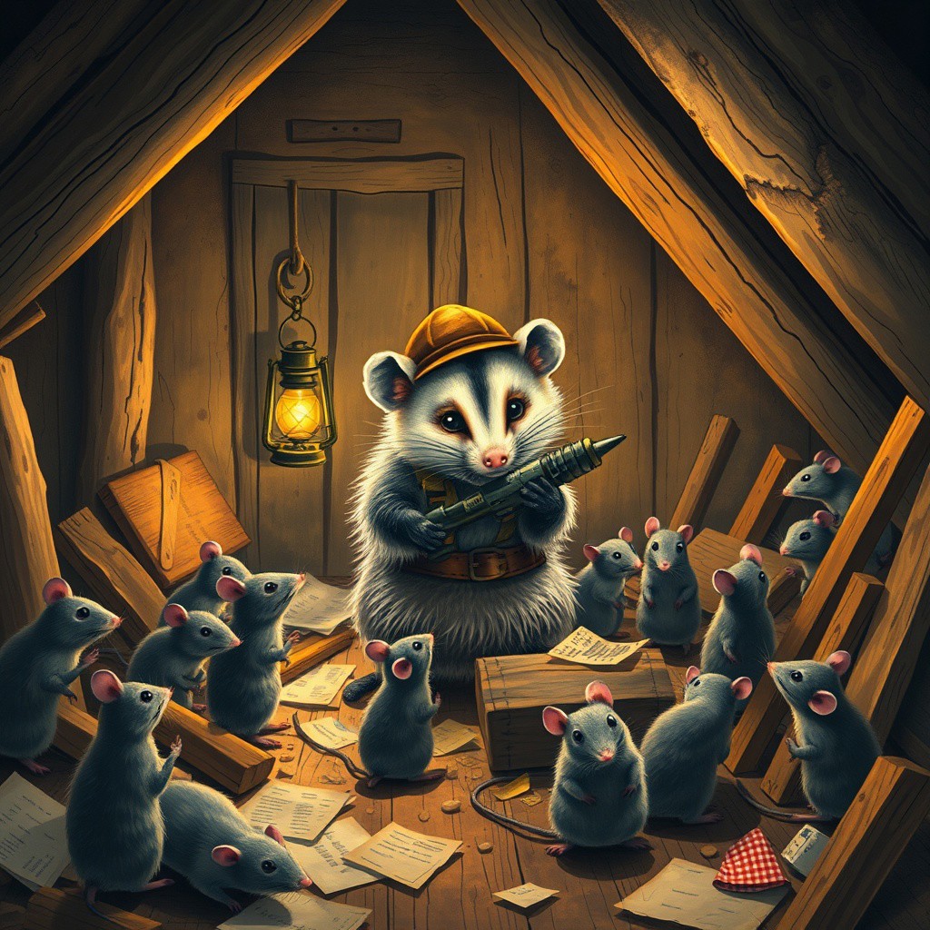 A small opossum dressed as a miner drills in the big attic of an old house. There is lantern in the corner, warm light. The hammer drill is big. The opossum is surrounded by group of grey mice. There are mess, paper, old wooden boards around. vivid colors, ukiyo-e style