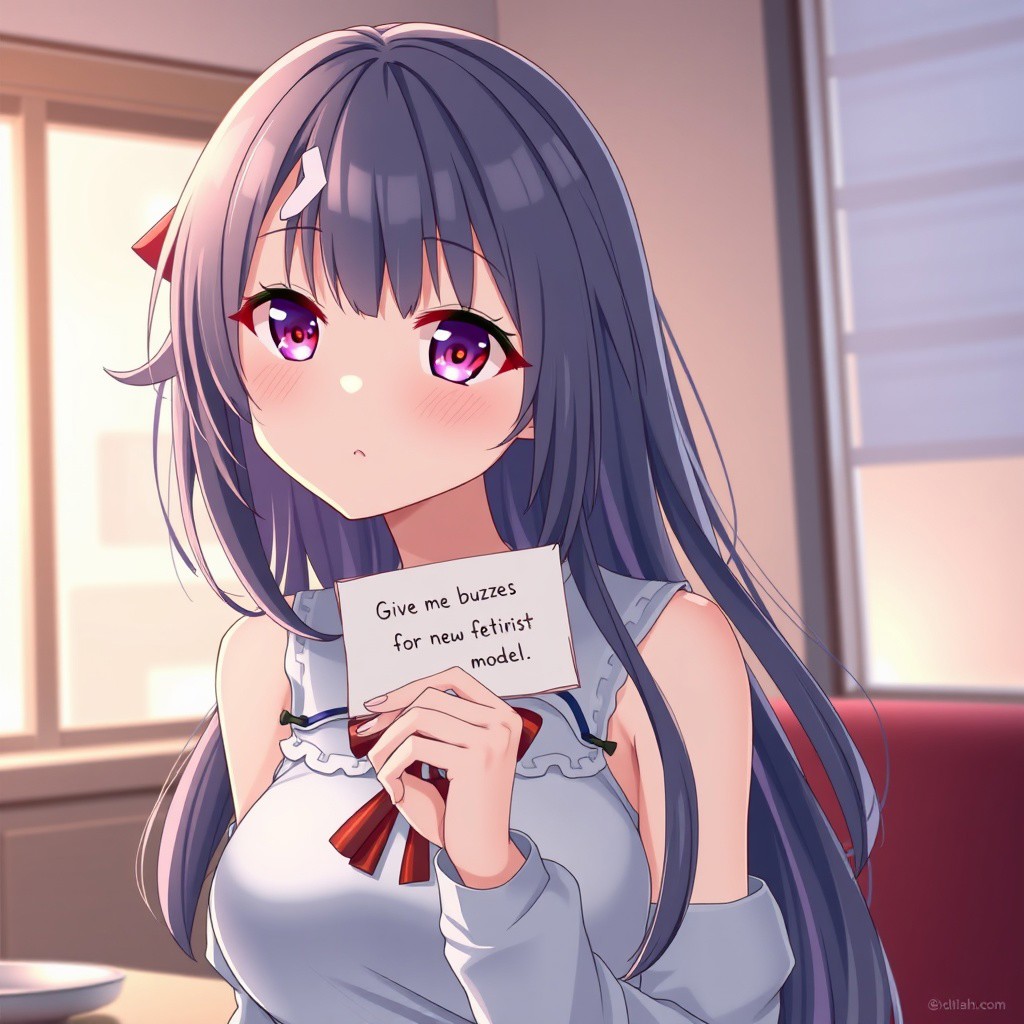 Anime girl holding a small note: ((("Give me buzzes for new fetishist model"]))