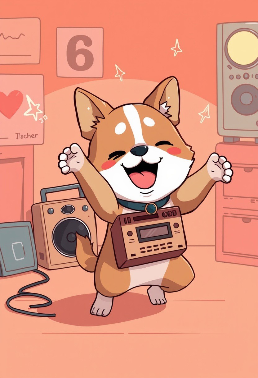 anime style, a dog break dancing with a boom box, chibi, breakdown,