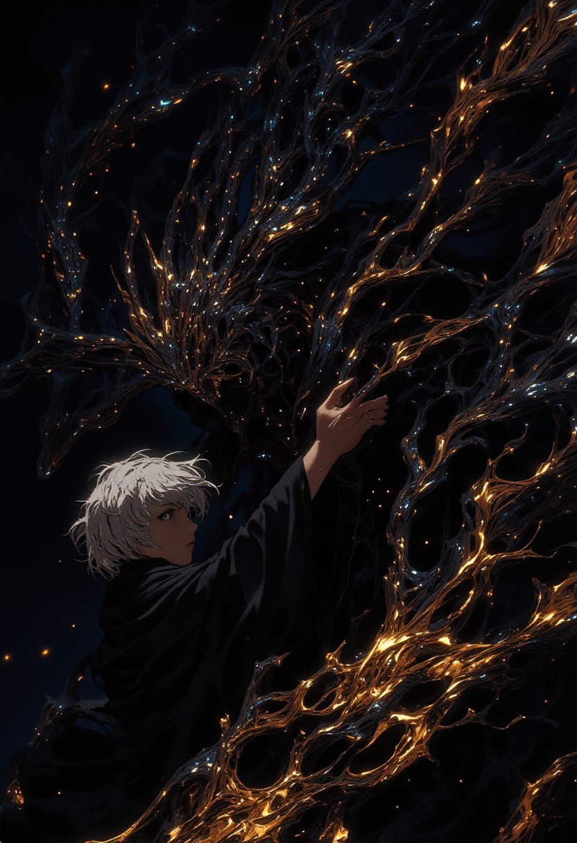 hyper realistic. a young child is standing alone against a gloomy backdrop. She has silver hair and silver eyes. She is draped with an oversized cloak of dark flames embedded with stars. The stars are white and gold. Her face is in focus but shadowed by her cloak. The cloak is the only thing illuminating the scene, and it gets darker the further away it is. Her arms are outstretched as if casting a spell. Her fair skin contrasts softly against the glittering cloak, and her expression is introspective, with slightly parted lips adding a touch of sensuality. The cloak catches the ambient light, scattering it into a dazzling display of shimmering reflections, resembling a star-studded night sky. The dim, ambient lighting enhances the intimate, moody atmosphere, casting gentle shadows that sculpt the contours of her face and body, emphasizing her serene yet enigmatic presence. The composition blends softness and glamour, fusing intimate elegance with a hint of otherworldly magic.