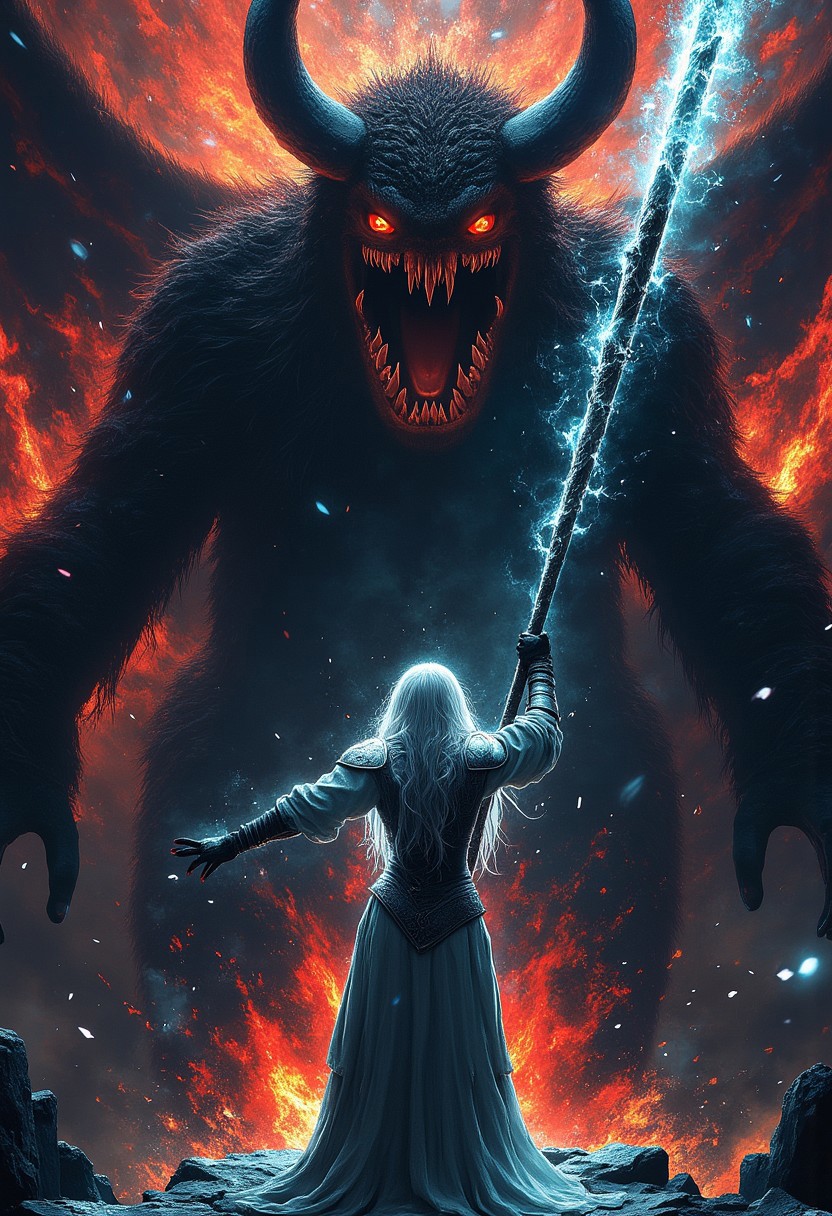 The focus is on a female silver haired mage holding her staff high above her with both hands in a final stand. The mage is wearing sleek armor that is damaged and breaking apart. She stand on the edge of a cliff overlooking a dark abyss and she is facing a balrog. The balrog is an enormous creature cloaked in black and crimson flames of death. The mage The tip of the staff glows with purity., The backdrop behind the mage and balrog is a swirling abyss of darkness, separated by streaks of pure white. The backdrop is centered behind the subject. The colors are separated by metallic fractures, creating a glowing mosaic effect. The colors of the backdrop are most intense near the center. The mage is a stark and vibrant contrast of hope against the encroaching darkness and despair., aidmamj6.1