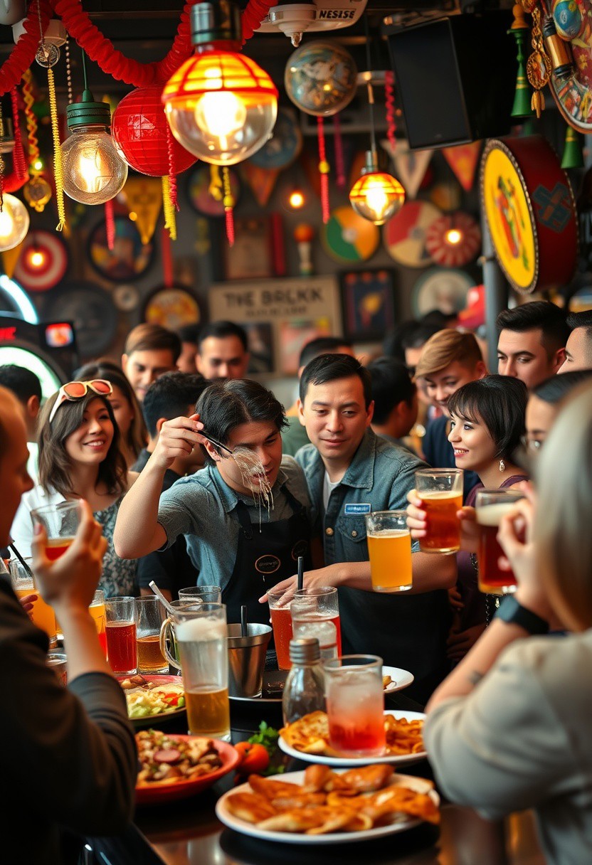 "A fun scene in a bustling bar with a lively atmosphere, colorful decorations and a diverse crowd. A young dark-haired bartender is overwhelmed, juggling several drink orders while spilling some drinks. Customers laugh and chat loudly , with a jukebox. A multitude of tapas and food, in Spain