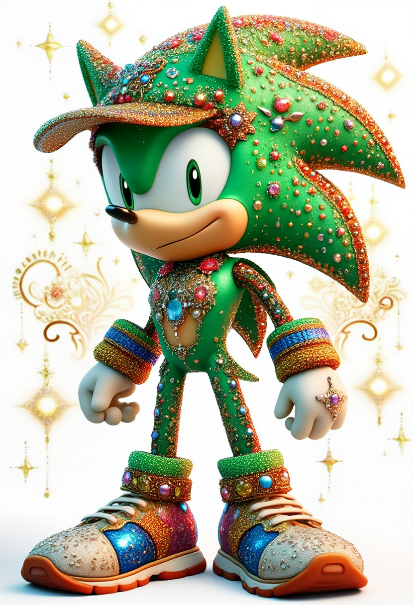 A cartoon drawing of sonic the hedgehog wearing green bl1ngfashion.
