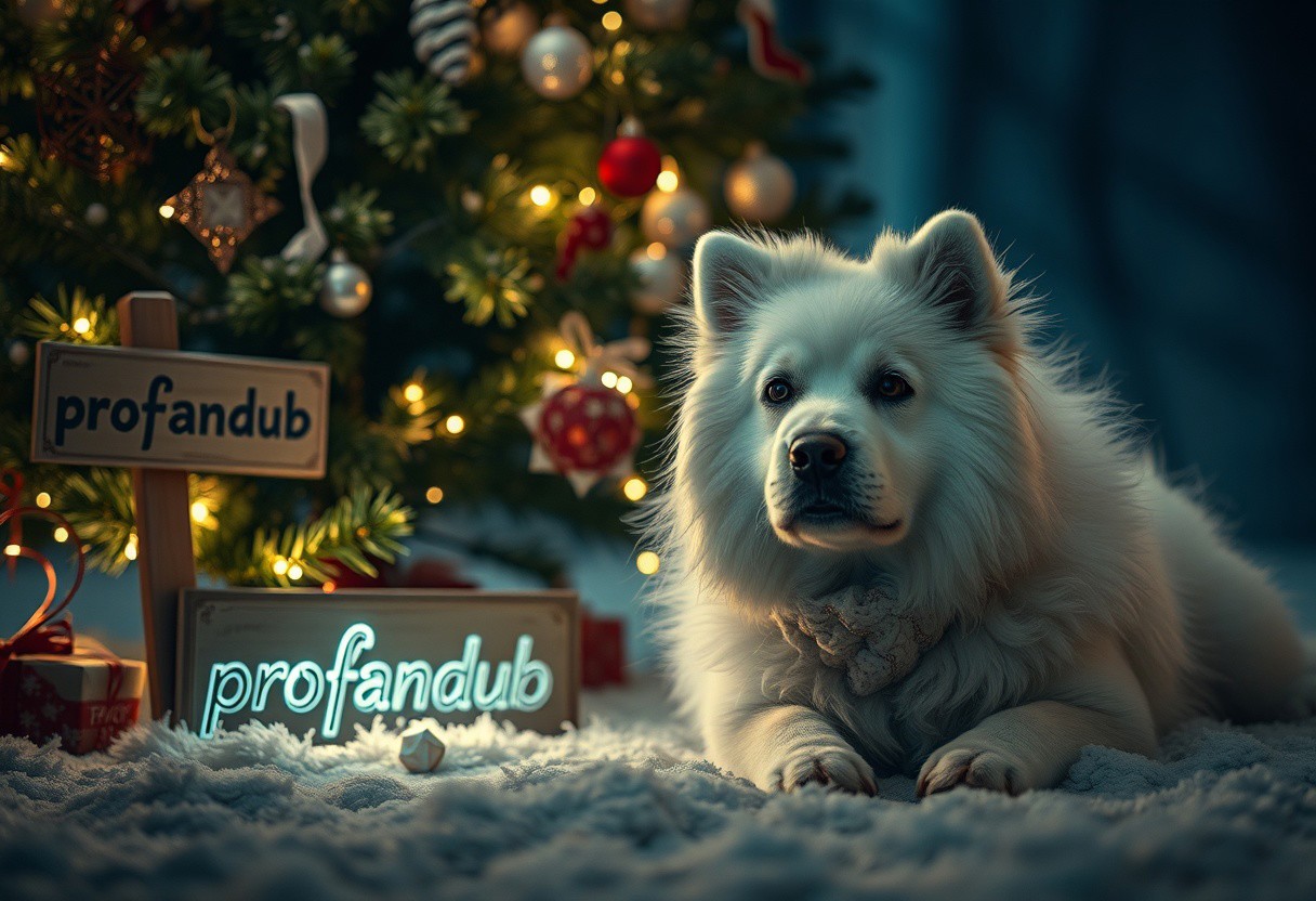 score_9, score_8_up,score_7_up, score_6_up, score_5_up, score_4_up, best quality, masterpiece, highres, soft lighting,atmospheric lighting, 8K, ,A white fluffy dog by a christmas tree, (((nearby lies sign saying "profandub")))