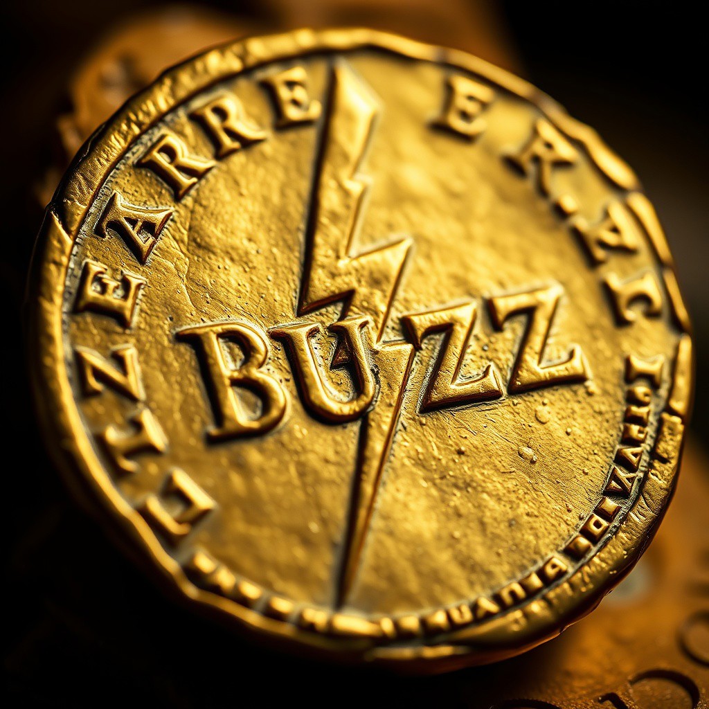 Closeup of a ancient Rome detoriated gold coin with lightning bolt symbol and text in ancient font saying BUZZ, realistic, masterpiece, dramatic light, depth of field