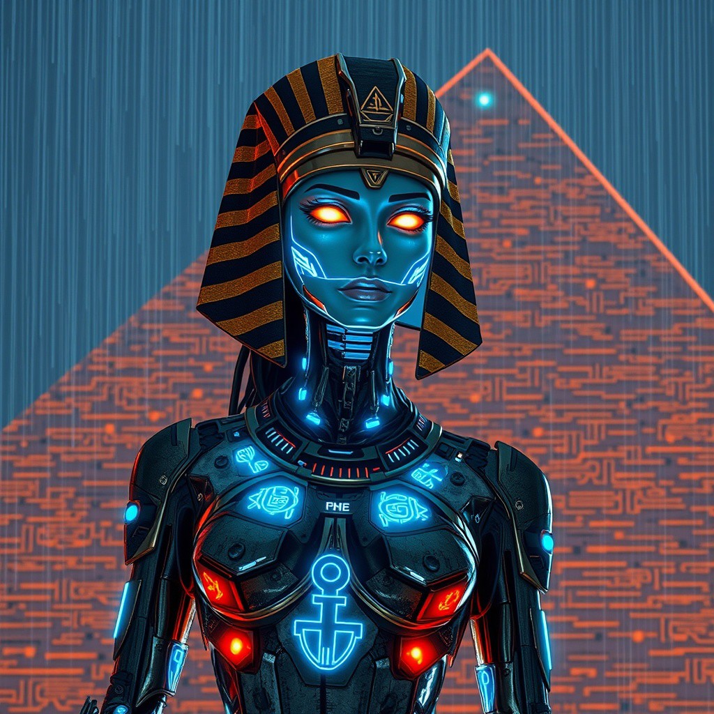 A lone cyborg enforcer stands atop a neo-pyramid in the neon rain. Her sleek, military-grade cybernetic body bears ancient Egyptian markings glowing in thermoptic blue. The enforcer's face, reminiscent of Major Kusanagi, is framed by a modernized Nemes headpiece with data cables instead of cloth stripes. Her eyes glow amber against the night, enhanced with targeting systems displaying hieroglyphic readouts. A translucent tech-ankh hovers before her, projecting tactical data in the air. Her thermoptic camouflage suit ripples like liquid metal, decorated with circuit-board scarabs that pulse with electric life. Behind her, the megalithic pyramid's surface is a perfect fusion of ancient limestone and modern carbon fiber, its edges traced by streams of data visualized as flowing digital hieroglyphs.