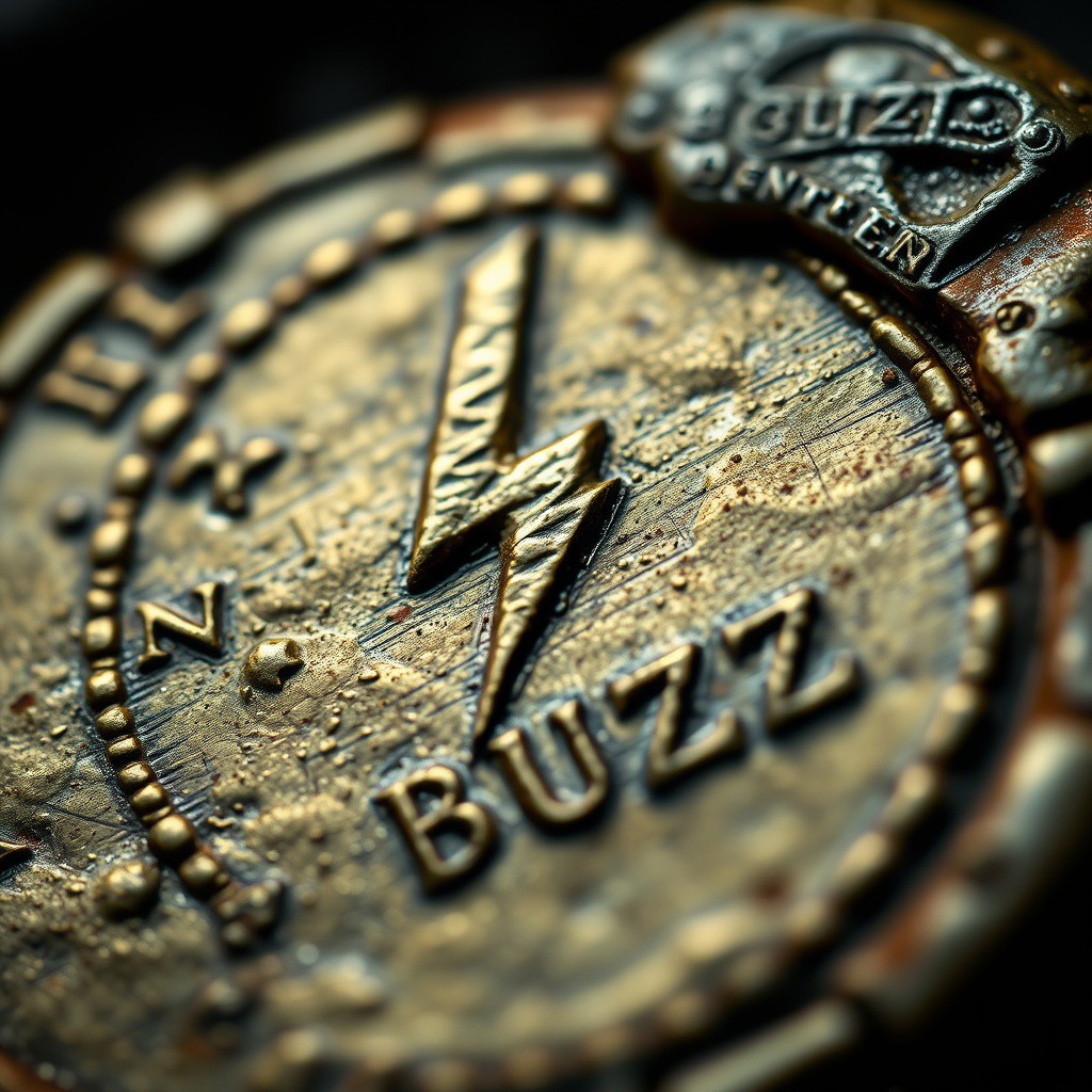 Closeup of a ancient Rome detoriated gold coin with lightning bolt symbol and text in ancient font saying BUZZ, realistic, masterpiece, dramatic light, depth of field