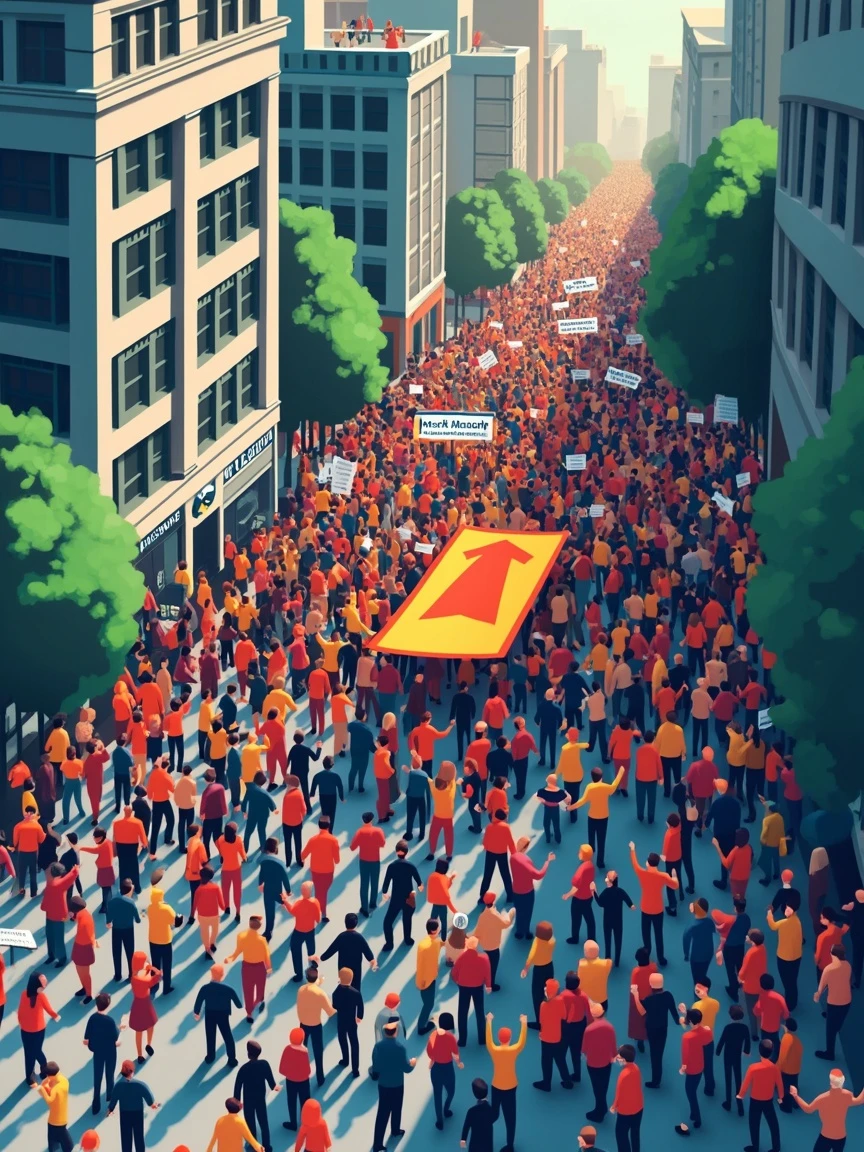 2d-isometric graphic of a political demonstration. Use the color schema #7eaeb5, #eeaa36, #b5fff4 Background: #0c1b1f Everything is to a maximum minimized and heavily stylized. People in a street with building left and right, carrying lots of signs and one banners. All people walking in groups into the same direction. The street and its surrounding is dark, while the people are bright and saturated.